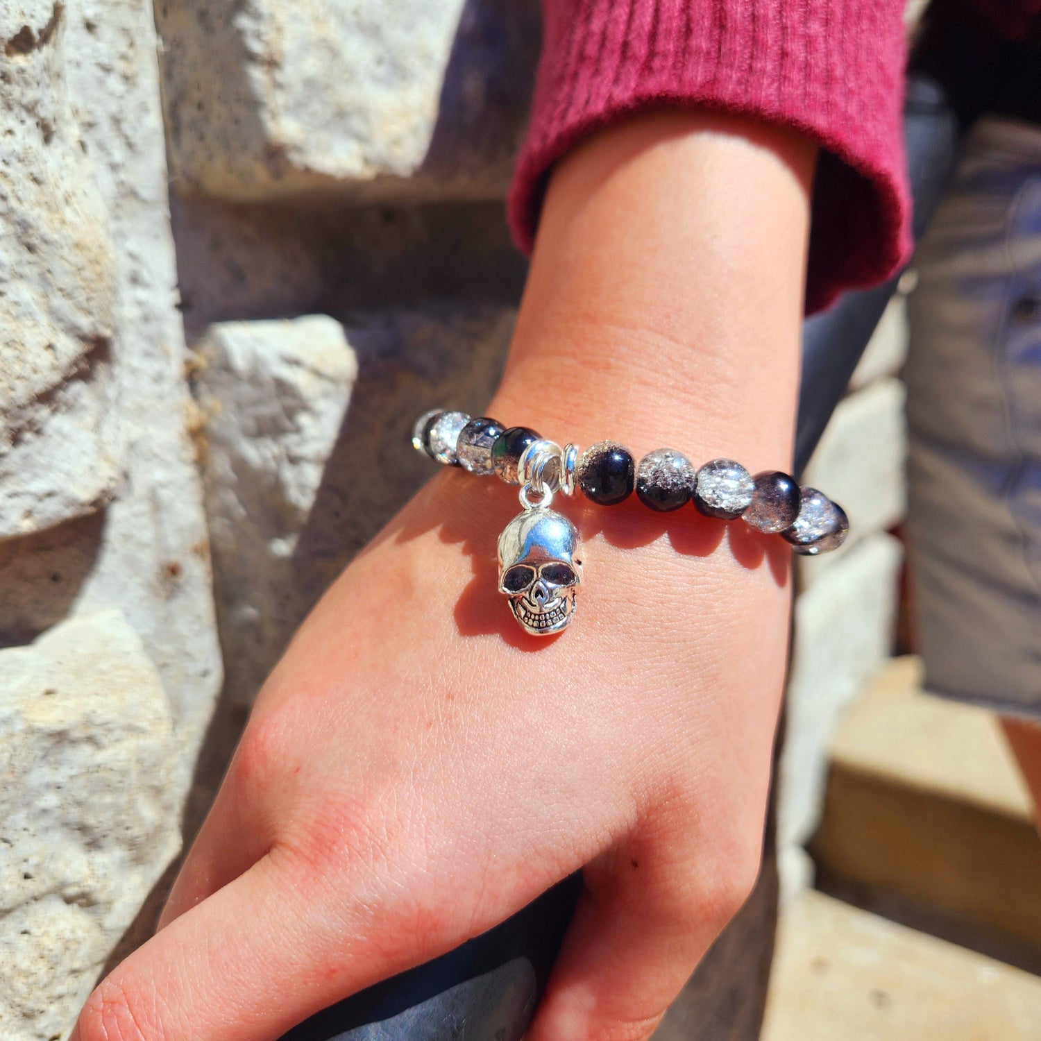 Add a little edge to your look with this black and clear crackle beaded bracelet, finished with a skull charm — perfect for spooky season style. 🎃