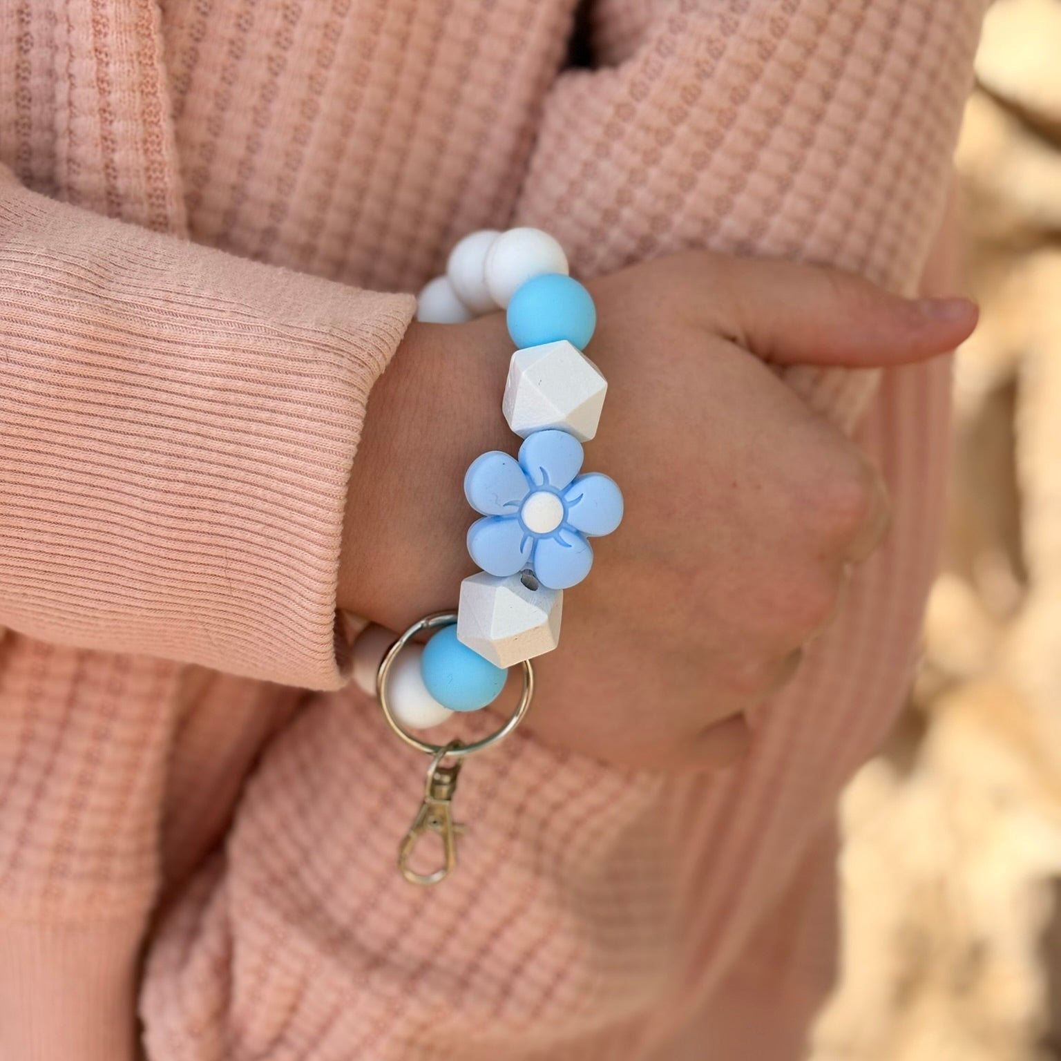 Designed with 15mm white and blue silicone beads, 18mm white wood hexagon beads, and a charming blue flower silicone accent bead, this wristlet is both trendy and practical. The silver keychain and claw clamp make it easy to attach and secure your essentials.