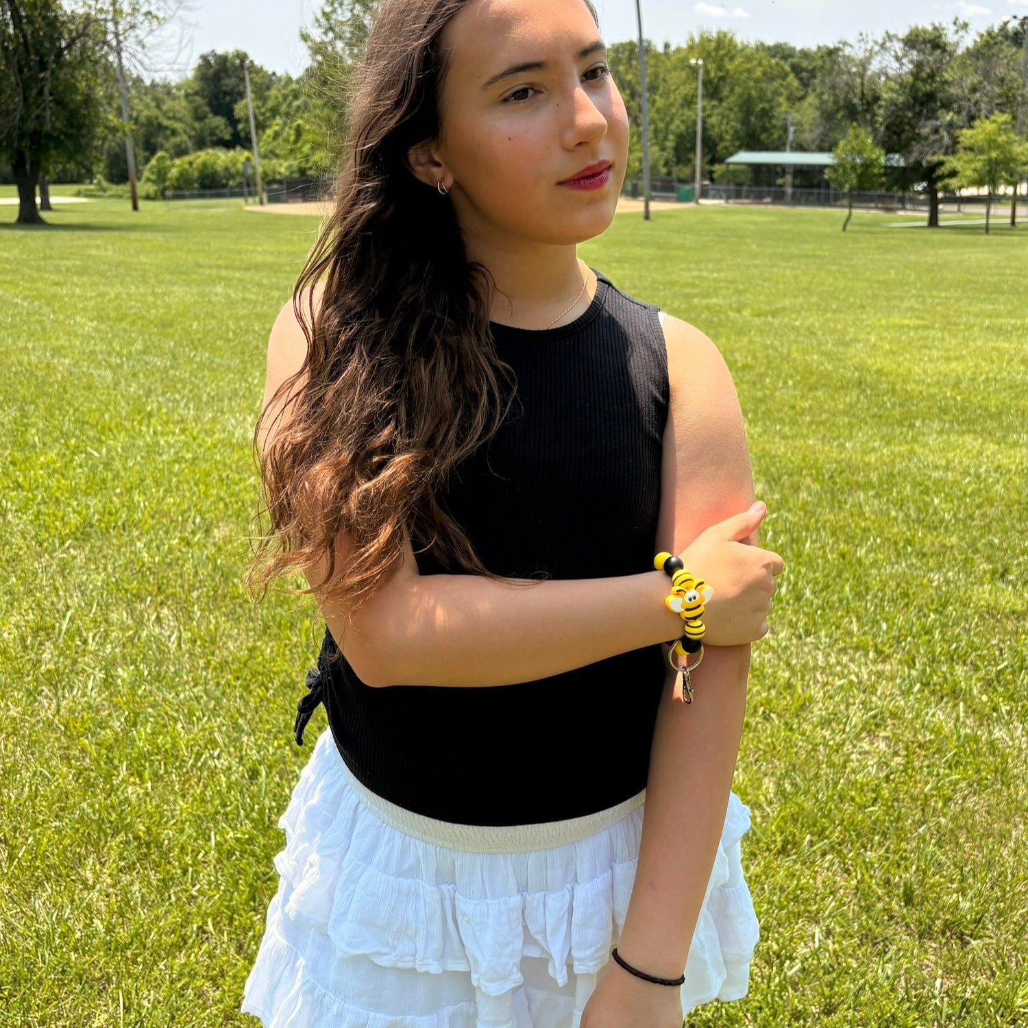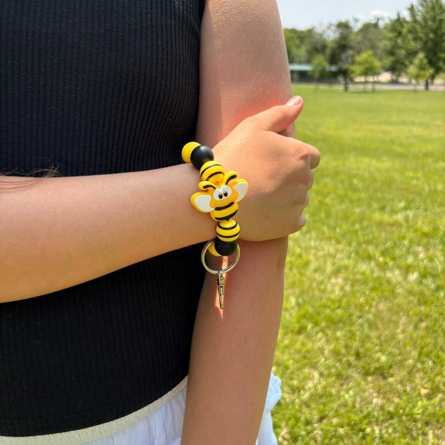 Designed to comfortably slip over your wrist, it keeps your keys or small essentials close at hand while adding a pop of sunshine to your day. Ideal for busy days, quick errands, or just showing off your bee-loving style.