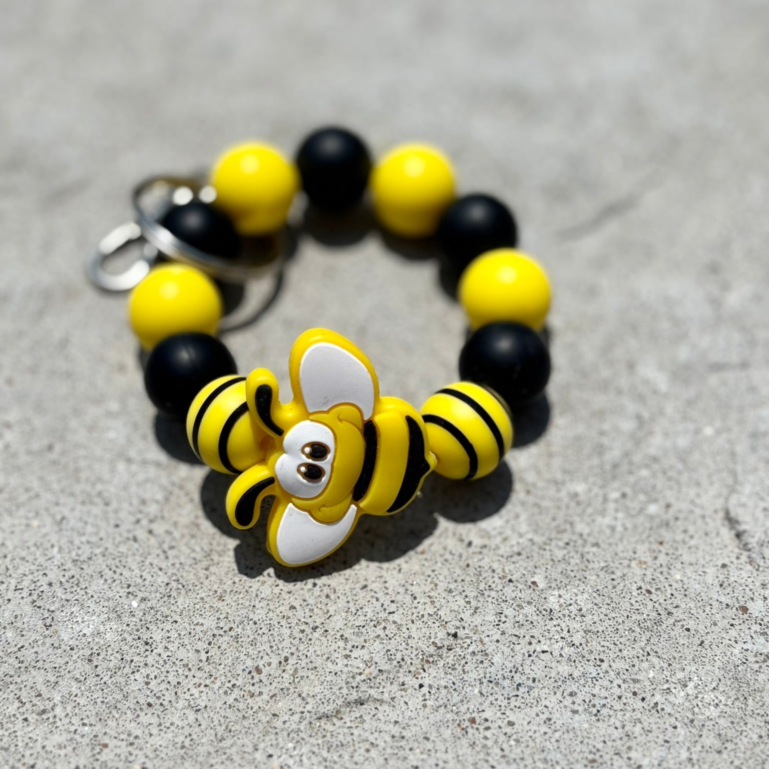 Bumblebee Bead Wristlet is the perfect blend of function and fun! Made with soft, durable silicone beads and featuring an adorable yellow bumble bee accent bead, this wristlet is both practical and playful.