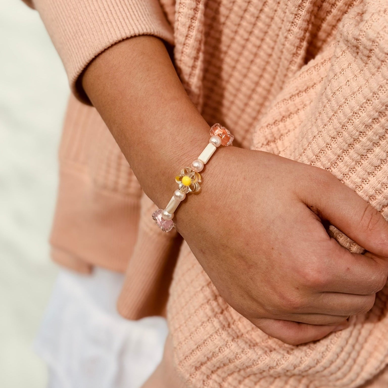 A delightful blend of playful colors and floral elegance. Featuring five plastic flower beads, each with a unique center color, this bracelet is accented with plastic pink pearl beads and pink tube glass beads for a fun, chic design. Perfect for adding a burst of color and joy to any outfit, this bracelet is ideal for spring and summer styling.