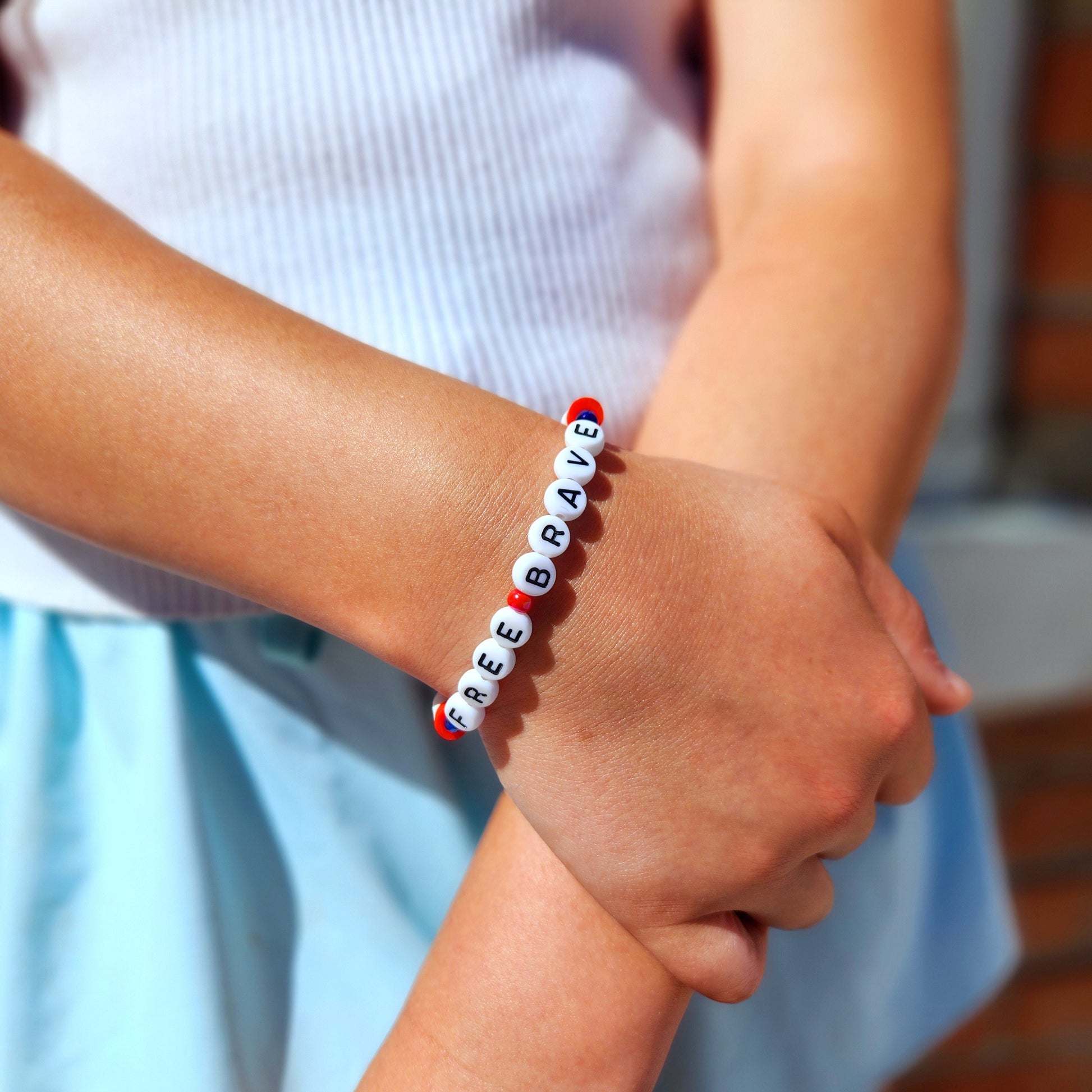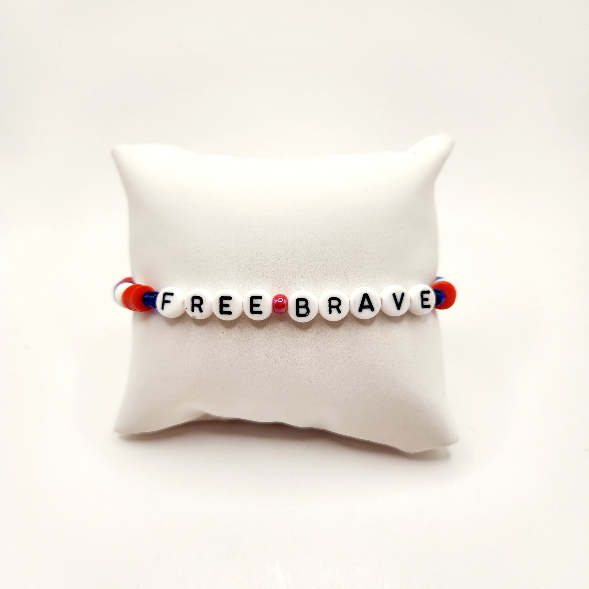 Our Free & Brave Beaded Bracelet is a tribute to strength, freedom, and individuality. Crafted with a mix of white and marbled white-blue clay beads, and accented by blue and red glass spacer beads, this bracelet is finished with black and white letter beads that proudly display the words FREE and BRAVE.