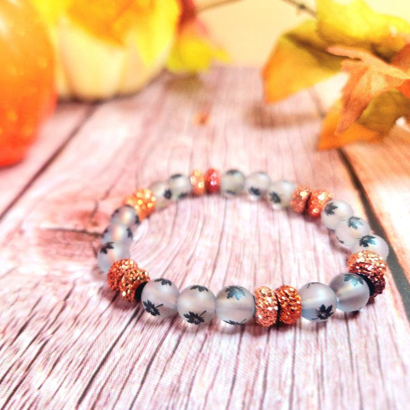 Bring the beauty of fall to your wrist with this dazzling seasonal bracelet. Featuring frosted 8mm maple leaf beads in rich autumn tones and sparkling rhinestone spacer beads, it’s the perfect mix of cozy charm and subtle shimmer.