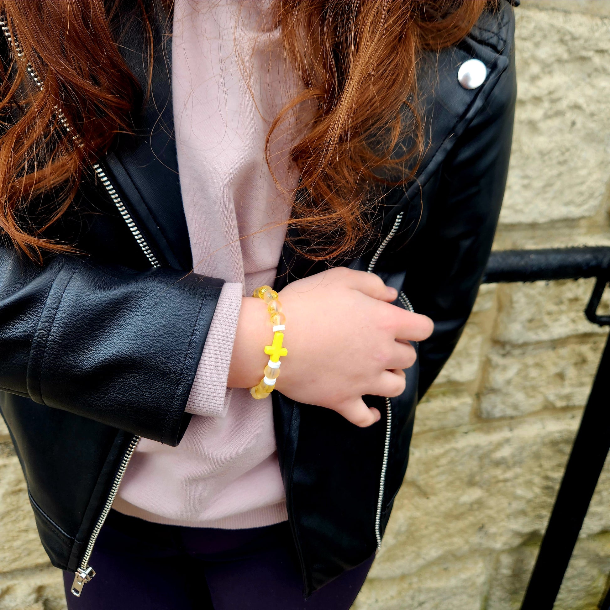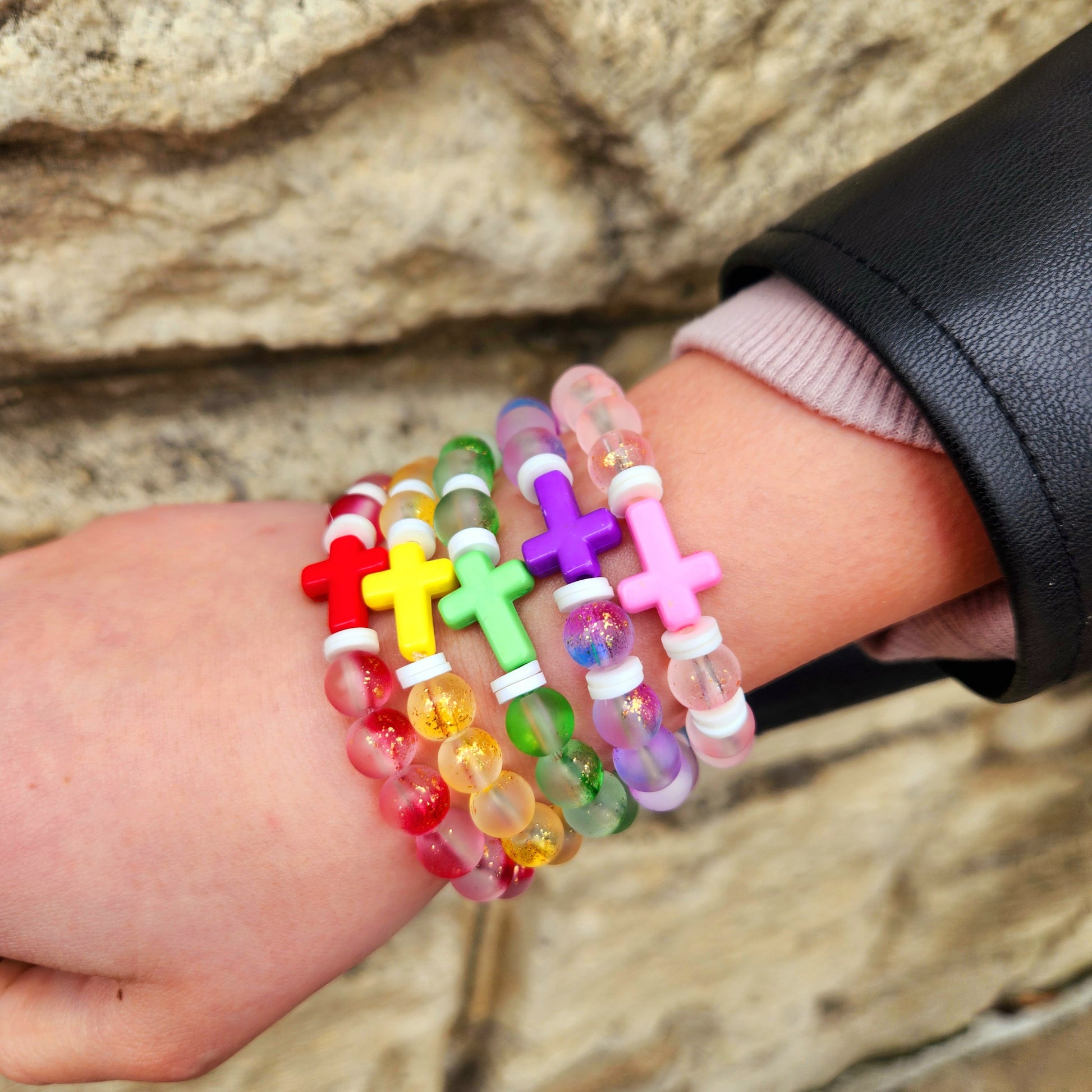 Yellow & Green: Made with 6mm translucent glass beads with subtle gold flakes, white spacer beads, and a matching cross bead — perfect for a more delicate and lightweight feel.