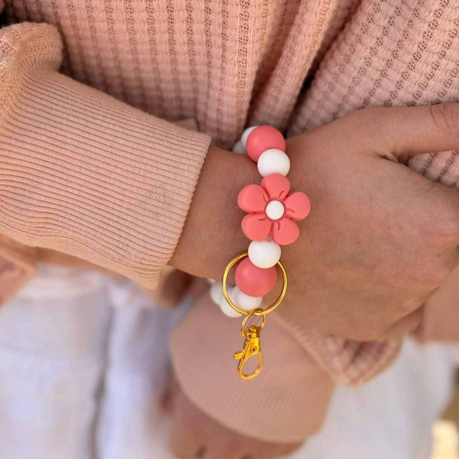 Designed with 12mm white silicone beads, 15mm pink wood beads, and a charming pink flower silicone accent bead, this wristlet is both trendy and practical. The gold keychain and claw clamp make it easy to attach and secure your essentials.