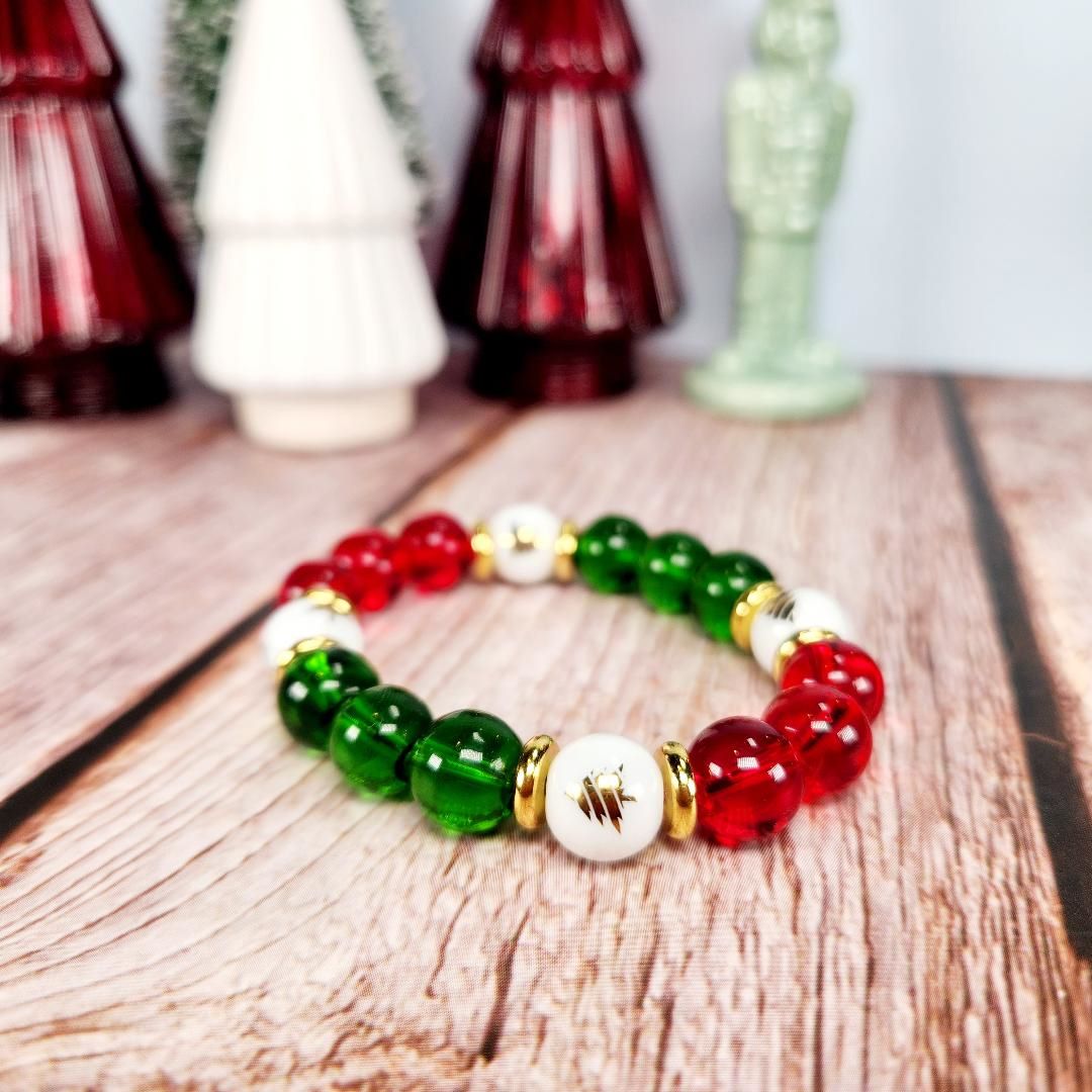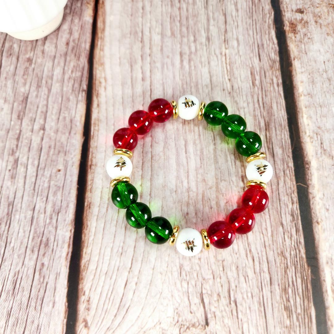 This cheerful bracelet features vibrant green and red glass beads accented with golden Christmas trees and elegant gold spacers—perfect for celebrating the season in style.