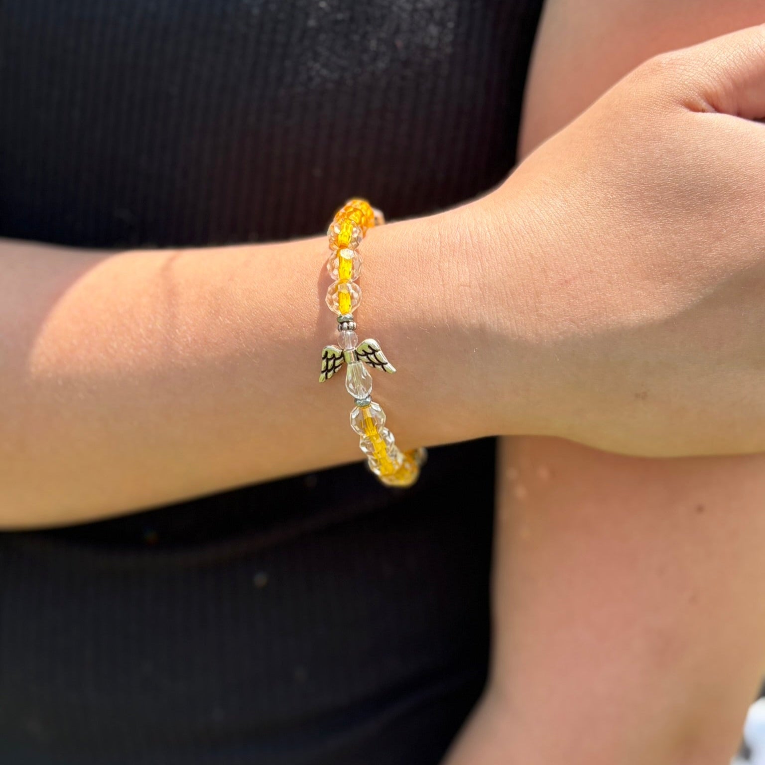 - Centerpiece: Glass-beaded angel charm with antiqued silver wings and halo